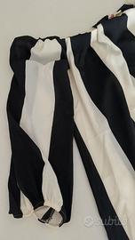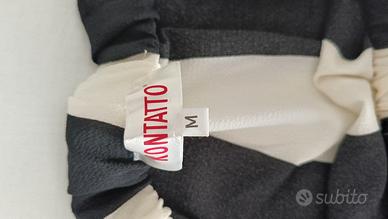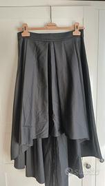L'ho indossato una sola volta, completo da me creato di 2 diversi brand, la gonna più corta davanti e lunga dietro. La camicia ha elastico per cui si può indossare in diversi modi. La maglia è in poliestere ed elastan, la gonna cotone ed elastan