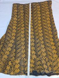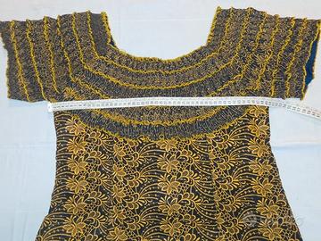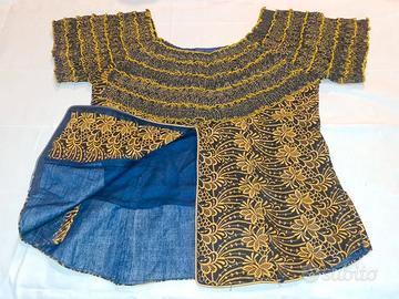 Completo donna Etnico realizzato con tessuto batik composto da corpetto con arricciature sulle spalle cerniera posteriore e fodera interna, e gonna svasata sotto con laccio per stringere. Misure precise sulla foto. Colore nero con disegni color senape