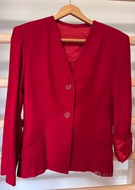 Tailleur primaverile sartoriale in tessuto fresco di lana color Rosso Valentino con bel bottone in tinta.