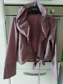 completo donna firmato Elisa Landri, formato da gonna e blusa aperta da annodare con fiocco laterale, colore rosa antico. Tessuto taffetà di seta stupendo. Taglia 44. La gonna è foderata, mentre la blusa non è Foderata.