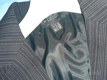 completo donna gessato grigio scuro con righino lilla. N.B. la giacca è taglia 44 mentre il pantalone e taglia 42.