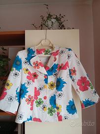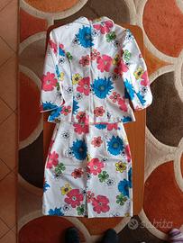 Elegante completo da donna stile vintage chic composto da giacca corta e gonna coordinata in tessuto bianco leggermente elasticizzato (78% cotone, 20% poliestere, 2% elastane) con fantasia floreale multicolore ( blu, rosso, verde, giallo e nero). La giacca presenta maniche a tre quarti, colletto con revers e un taglio leggermente sagomato che valorizza la figura. La gonna è dritta, sopra il ginocchio, chiusura davanti con cerniera e due bottoni. Il completo ha uno stile fresco, femminile e primaverile, ideale per chi ama i capi particolari e colorati. Misure: