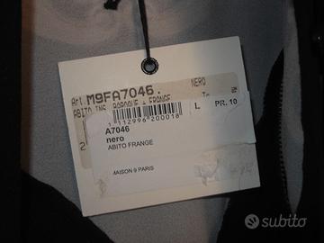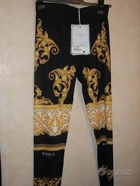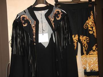 completo con abito lungo nero , stampa barocca e frange avanti e dietro, abbottonato sul d'avanti e collo coreana, leggins elastico in vita e stampa barocca ,taglia L nuovo con cartellino