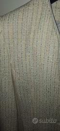 Tailleur Sisley indossato solo per la sfilata, con il materiale che sembra avere "glitter", morbido al tatto, con la scollatura della giacca a "v". Gonna tipo tulipano, sopra le ginocchia. Ha un colore chiaro/ luminoso, di grande effetto. È praticamente "pezzo unico" fatto per una sfilata privata. Si può indossare anche solo indossando un reggiseno, oppure solo la gonna/ giacca, separatamente.