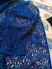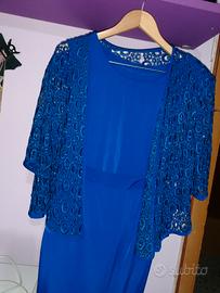 Completo donna taglia 42,composti da tre pezzi : gonna, camicia e giacca. Gonna e camicia in raso in seta, giacca in macrame. Cucito su misura. Blu cobalto lucido. Indossato poche volte e in ottimo stato.