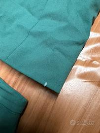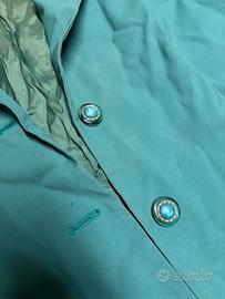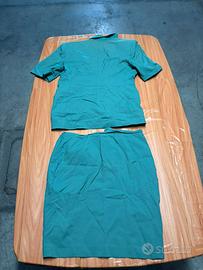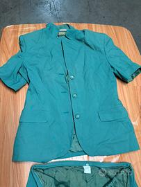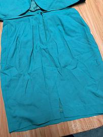Elegante completo donna firmato I Sovrani Moda, Made in Italy 🇮🇹, composto da giacca e gonna coordinata in raffinata tonalità verde acqua. La giacca presenta maniche corte, chiusura con bottoni frontali e tasche decorative. La gonna è a vita alta con zip posteriore e lunghezza midi, dal taglio classico e femminile. Capo vintage di qualità italiana, perfetto per occasioni eleganti, ufficio o per chi ama lo stile anni ’90. Tessuto leggero e piacevole da indossare.