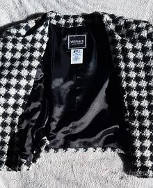 Giacca corta vintage Versace Jeans Couture bouclé pied de poule. La giacca ha 6 bottoni dorati con l'iconica testa di medusa Versace (2 bottoni di riserva). Anni '90.