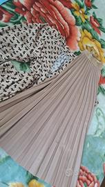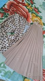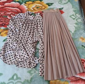 completo composto da camicia e gonna plissettata in tonalità beige/nude. Camicia: modello morbido taglia unica con stampa fantasia cagnolini neri, maniche lunghe ampie con polsini. Chiusura sul collo dietro a bottone. Tessuto satinato leggero. Nell'etichetta c'è scritto taglia S ma veste benissimo anche una M ( taglia che indosso io) Gonna: plissettata, vita alta con elastico, linea fluida e femminile, perfetta per valorizzare la figura. Veste bene una S e una M. Materiale similpelle, senza difetti.l'elastico della gonna è in velluto. Entrambi i capi hanno il dettaglio della stellina. Completo indossato solo una volta ad una cerimonia. Vestibilità comoda Nessun difetto da segnalare è come nuovo.