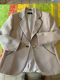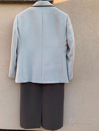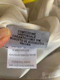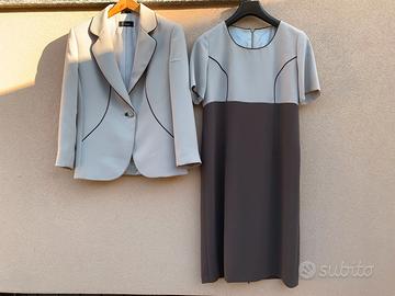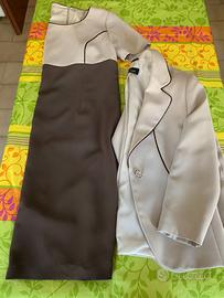 Elegante completo sartoriale da donna bicolore, composto da una giacca strutturata e un abito coordinato a maniche corte in tonalità beige e tortora, foderato. Giacca: Presenta un taglio sartoriale con ampi revers e una chiusura a un solo bottone gioiello centrale. Lo stile è caratterizzato da profili a contrasto in marrone scuro che disegnano linee grafiche sul davanti Misure: spalle circa 42 cm. -lunghezza dal bavero 63 cm – lunghezza manica 53 cm. Abito: Modello a tubino con scollo rotondo e maniche corte. È diviso in due blocchi di colore: la parte superiore è beige chiaro, mentre la parte inferiore è di un marrone tortora più scuro, presente una cerniera sulla schiena a scomparsa. Misure: spalle 39 cm. - lunghezza 100 cm– ascella ad ascella 49 cm- spacco sul retro cm. 20 Tessuto come da etichetta 100% poliestere Made in Italy prodotto da Pamar confezione sartoriale di alta qualità Perfetto per cerimonia. Non risulta presente alcuna etichetta relativa alla taglia. Ottimo poco utilizzato