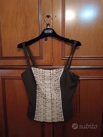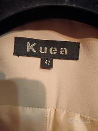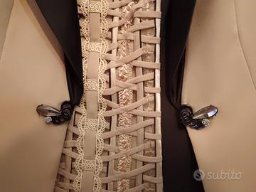 Completo elegante firmato Kuea, composto da giacca, corsetto ricamato e gonna coordinata.