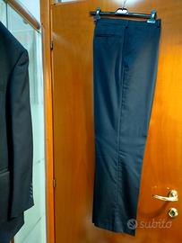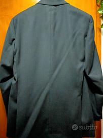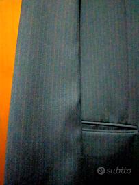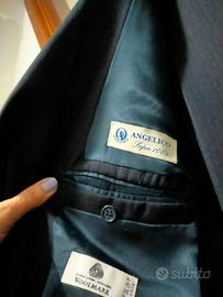 Completo elegante uomo giacca e pantalone, gessato blu scuro. Tre bottoni, taschino esterno e due tasche. Due taschini interni. Pura lana vergine. Tg. 52. Angelico, ginalebole