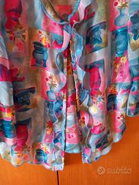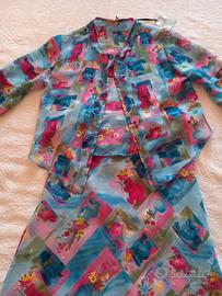 Completo estivo donna di alta moda composto da gonna longuette e blusa aperta sul davanti, marca Liu Jo Milano, made in Italy, taglia S, tessuto di seta con fantasie in rilievo con colori molto delicati e a tratti leggermente lucide, leggero e fresco che non si stropiccia. Scollo camicia a V con volant, abbottonatura per metà con gancetti microscopici, taglio molto particolare: arrotondato, con maniche tre quarti e polsino a campana. Gonna foderata con elastico in vita che ripete il modello scampanato della blusa. Nuovo con cartellino, su cui si può leggere il prezzo originale.