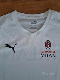 Completo T-shirt +pantaloncino . Maglietta bianca Fondazione Milan marchio Puma taglia S. Pantaloncini neri neutri marchio Puma taglia M compatibili con la T-shirt per vestibilità. Entrambi tessuto tecnico DRYCELL. Dettagli misure T-shirt Lunghezza manica 38cm Larghezza cavi ascellari 46cm Altezza da scollo inferiore 61cm Larghezza bordo inferiore 46cm Dettagli misure Pantaloncini Larghezza vita 38cm Altezza cavallo 29cm Altezza gamba 47cm