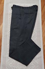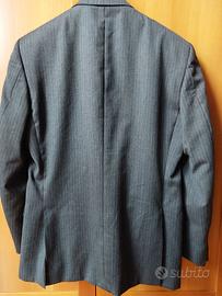 Abito gessato grigio, giacca tre bottoni, spacco all'americana, completo di relativo pantalone. Un passepartout che non dovrebbe mancare in armadio.
