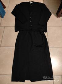 La giacca presenta una misura di spalla 44 e lunghezza 76, mentre la gonna ha una lunghezza di 69 e vita di 37 con elastico.