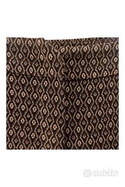 Completo da donna composto da giacca lunga senza, allacciatura e pantalone a vita bassa con allacciatura nascosta con gancio e cerniera, stile anni 70 a fantasia marrone.