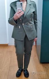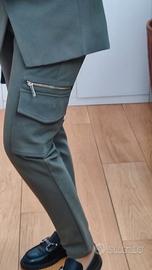 tailleur pantalone di gusto moderno, verde militare, bottoni dorati, tasche applicate, marca Fracomina, condizioni pari al nuovo