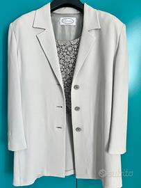 Elegante completo composto da giacca modello lungo e gonna al ginocchio. È stato aggiunto un corpetto sartoriale in pizzo sempre grigio perla. Si vende tutto insieme.