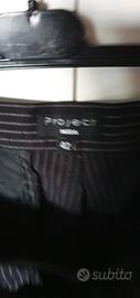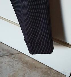 Completo giacca corta a tre bottoni e pantalone capri/pinocchietto con risvolto , Project Basic di colore blu gessato, taglia 42; Tessuto adatto alla primavera e autunno; Usato poche volte, praticamente nuovo;