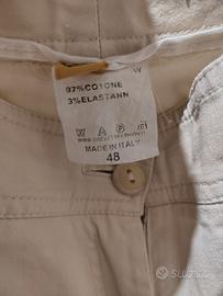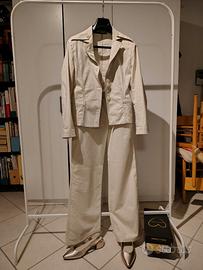 Completo in cotone elasticizzato, made in Italy, con pantapalazzo, giacca avvitata, tasche con motivo richiamato su pantalone.