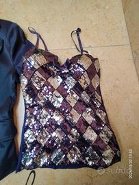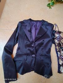 vendo giacca sagomata taglia s, colore melanzana, adattabile sia ad un abbigliamento sportivo che elegante. made in Italy. in abbinamento, un top con paillettes dello stesso colore della giacca e argento, con bretelle regolabili e coppe all'interno. il completo lo vendo 15 euro. In buono stato, perché usato pochissimo.