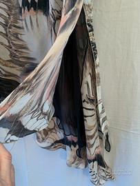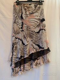 Completo bluse e gonna, percetto per cerimonia, elegante e raffinato, fantasia con tonalità sfumate La bluse ha scollo a V e voulant intorno allo scollo La manica termina con un voulant a campana La gonna midi, e’ asimmetrica Non è trasparente, ci sino tre strati leggeri Quello in mezzo è nero Spacco laterale, con diverse altezze dei tre strati Come nuovo Stilista Giulia Galanti, tg L