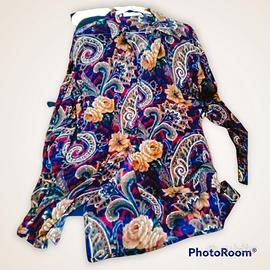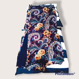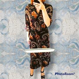 Completo vintage brand Marly's (made in Italy) con gonna e camicia fantasia damascata e fiori, si compone di gonna lunga chiusura a portafoglio con spacco laterale ed elasticizzata in vita segnata taglia 42 veste bene una S/M. Camicia stessa fantasia e taglia lunga che si può portare in vari modi anche annodata, veste comoda stile oversize avendo le spalle cadenti. completo in 100% viscosa usato poco come nuovo senza alcun segno di rovina. Adatto alla stagione autunnale primaverile.