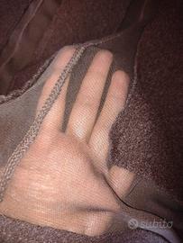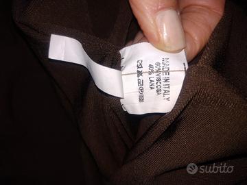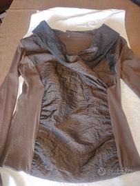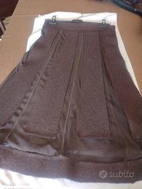 Completo con gonna a strisce in lana cotta e sotto in tulle trasparente e bordo in lana cotta. Vita con elastico 38-42 cm lunghezza 72 cm. Maglia in taffettà sul davanti con collo ad incrocio e dietro e maniche in tulle trasparente. Manica 55 cm spalla 46 cm