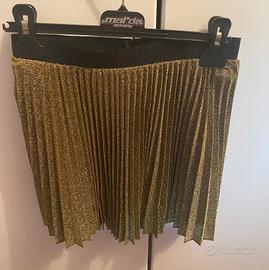 La gonna è plissettata, colore oro leggermente in lurex con vita elasticizzata e cerniera