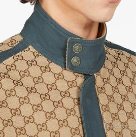 Il set comprende giacca e pantalone in tessuto premium con iconico monogramma GG Supreme e dettagli in contrasto blu navy.