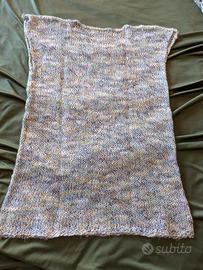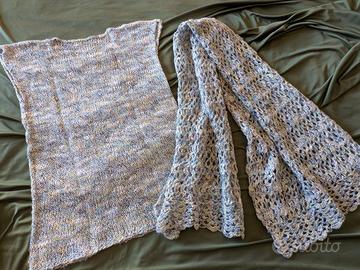 Vendo questo raffinatissimo completo artigianale, che ho realizzato io stessa a mano con estrema cura. Il set è composto da: Maglia lavorata ai ferri: maglia rasata, vestibilità morbida e confortevole. Presenta una bellissima sfumatura di colori pastello (azzurro, verde salvia e panna) che la rende facile da abbinare. Stola coordinata all'uncinetto: Lavorata con un delicato punto traforato a ventagli. Perfetta da poggiare sulle spalle o da usare come maxi sciarpa. Nuovo, fatto da me. Le misure della maglia sono: circonferenza seno cm 88 circonferenza fianchi cm 100 Lunghezza cm 68 La stola a uncinetto è lunga cm 156 e larga cm 50. Il filato è un misto cotone/lana. Pezzo Unico, non ne esiste un altro uguale al mondo! Perfetto per una cerimonia, un’occasione speciale o per dare un tocco Boho-chic al look quotidiano.