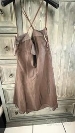Completo in lino marrone composto da abito e giagghino con manica 3/4,finte tasche sul davanti e bottone.Spalline incrociare in rasatello di cotone e cerniera laterale sinistra con particolare di coccarda sul davanti (staccabile a piacere) .