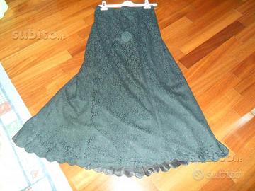 Meraviglioso completo di pizzo nero composto da bolerino corto abbottonato sul davanti e lunga gonna alla caviglia svasata.Era un vestito da sposa poi tinto di nero.Si tratta di un completo antico,fatto interamente a mano,con cappe sul fondo sia del bolerino che della gonna con all'interno dei piccoli pesi.Il bolerino è foderato solo sul corpetto,con maniche lunghe trasparenti e bottoncini sui polsi.La gonna è interamente foderata.Si tratta di un capo molto elegante e di pregio.Usato solo ua volta e in ottimo stato.Taglia 42-44 circa.