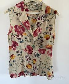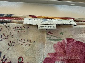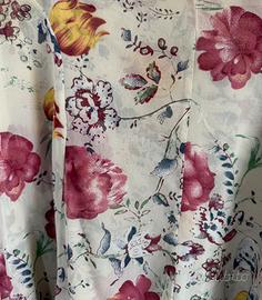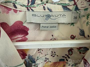Completo in 100% seta del marchio BLUNAUTA - storico marchio noto per la raffinatezza dei materiali e la cura sartotiale - MADE IN ITALY . Il coordinato - gonna e camicia - e’ perfetto per un look elegante e originale . Il tessuto (seta ) e’ legererissimo, impappabile e cade a pennello sul corpo regalando una sensazione di confort unica . La raffinata fantasia floreale su base crema/avorio, con grandi peonie rosa antico/bordeaux e tulipani gialli e arancioni rende questo completo molto particolare. I colori sono vividi ma delicati, molto chic. Camicia Smanicata: • Taglia 38 (riportata sull'etichetta). • Scollo a V con colletto a rever. • Chiusura frontale con bottoncini madreperlati. • Due pratiche taschine sul petto. • Taglio classico, leggermente sciancrato. Gonna Asimmetrica (La vera particolarità!): • Taglia 40 (riportata sull'etichetta). • Fondo asimmetrico e irregolare (che crea un movimento fluido, dinamico e super femminile ad ogni passo. Chiusura laterale con piccoli bottoncini a scomparsa. La combinazione tra la seta di alta qualità di Blunauta e il taglio moderno e scenografico della gonna asimmetrica rende questo set un capo d'abbigliamento versatile: perfetto per una cerimonia (abbinato a un sandalo gioiello) o per un aperitivo estivo ricercato. La gonna, in particolare, è un pezzo di design che non passa inosservata. Ottime condizioni vintage. Il capo è in ottime condizioni , e’ stato conservato con cura,