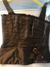 Completo pura seta Luisa Spagnoli, top e gonna. In seta marrone cangiante, brand di alta qualita’. Top tg 40, misura lunghezza 51 cm, da ascella ad ascella 42 cm, vita 36 cm, bretella 16 cm. Gonna ampia a piccole balze, tg 42 misura vita 37 cm, lunghezza 52 cm. Compresa spilla fiocco e gioiello sul top. Ottimo per le occasioni speciali, una vera icona di eleganza e raffinatezza