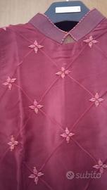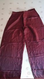 Vendo bellissimo completo in seta indiana nuovo, mai indossato, color bordeaux, composto da un abito smanicato con corpino lavorato con perline sul davanti, zip sul dietro, collo alla coreana e due pannelli in voile davanti e dietro con apertura totale laterale e da un pantalone palazzo sempre di seta con apertura con zip. Taglia di entrambi i pezzi: M. Misure pantalone: lungh. gamba est. cm 106, lungh. int. cm 74, circonf. vita cm 75, circonf. coscia cm 64. Misure vestito: lungh. tot da c.dietro cm 124, largh. spalle cm 33, largh. petto cm 44, lungh. corpetto ricamato cm 40 e poi voile. Prezzo 55 eu leggermente trattabile.