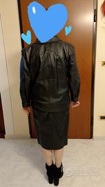 Completo in vera pelle gonna a portafoglio con tasche davanti e giacca con doppio collo a scialle