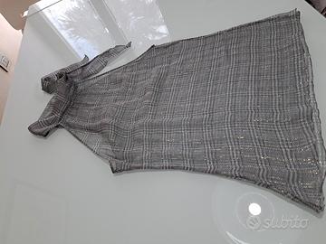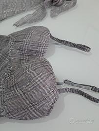 Completo Intimissimi in pura seta, grigio con inserti in oro e argento, top con coppe imbottite che veste una seconda di reggiseno e spalline, smanicato con collo da annodare, da indossare o insieme o singoli, taglia S. Indossato solo a una cerimonia. Spedisco solo con UPS,BRT o Poste italiane.