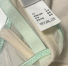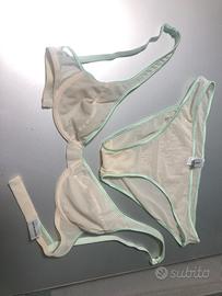 Completo intimo Intimissimi originale composto da reggiseno non imbottito con ferretto Tg.1a e comodo slip a vita bassa Tg. 3a. Velato, in colore panna e rifinito in verde acqua. Nuovo mai indossato