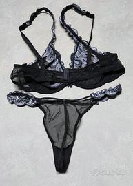 Set reggiseno in tulle nero e pizzo blu argentato tg. 2 coppa B, tanga in tulle nero davanti e pizzo sui fianchi. Esattamente come da foto Nuovo senza etichetta.