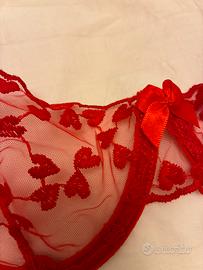 Completo intimo (reggiseno piu mutande) in pizzo rosso con cuoricini, taglia S ma puo calzare una M. Nuovo mai usato. Ritiro a mano a Milano zona centro o Buonarroti.