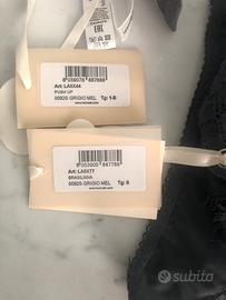 Completo intimo in pizzo Twin-set, nuovo con cartellino, color grigio piombo, parte superiore push up tg.I con lunette estraibili, parte sotto brasiliana tg.II.