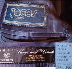 Vendo completo in pura lana vergine, made in italy e del marchio Recos. Il "difetto" presente è riportato in foto ed è la tasca all'interno della giacca. Veste "regular" in stile vintage ed è stato realizzato per una corporatura tipicamente maschile. Taglia 48