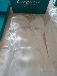 Completo Sposa composto da Beby doll, pigiama, camicia da notte è vestaglia di raso sulle maniche,pieghe è altezza seno tutto ricamato su stoffa di raso completamente nuovo mai indossato, ancora negli appositi scatoli con valigetta di velluto marcato lingerie Paris €350