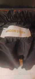Modello del pantalone molto particolare. Sul davanti e sul retro è di due tessuti diversi. Sui laterali presenta ciappe su una bordatura di colore rosso che si agganciano su di una bordatura di colore verde