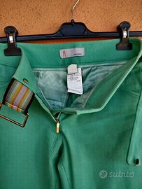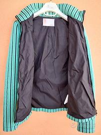 Completo Missoni verde acqua e nero, taglia 42. La giacca , interamente foderata è in poliestere trapuntato a righe verticali nere, si apre con una lunga cerniera a doppio cursore e ha due cerniere laterali che chiudono le tasche. Il pantalone verde acqua è in cotone. Vero Affare. Il prezzo non è trattabile.