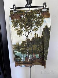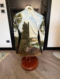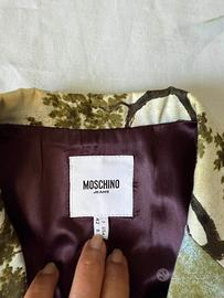 Giacca e gonna Moschino Vintage stampa rarissima originale Moschino. Effetto trompe l'oil con paesaggio pittorico di Pierre Lecomte e logo "Moschino Pierre Lecomte peintre" stampato sul tessuto. Da collezione. Taglia 42. Tessuto 98% in cotone e 2% in elastame. Ottimo stato indossato 2 volte. Ulteriori foto disponibili a richiesta.