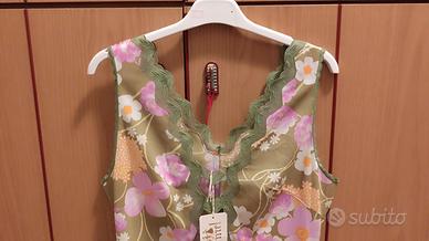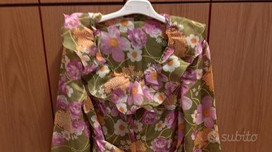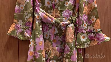 Set notte vintage autentico, composto da sottoveste lunga e vestaglia coordinata. Fondo verde oliva con vivace stampa floreale rosa, bianca e arancione. Sottoveste con scollo a V e pizzo verde; vestaglia con ampie ruches sullo scollo, maniche a campana e cintura. Entrambi i capi sono nuovi e conservano il cartellino originale dell'epoca. Capo di corredo.
