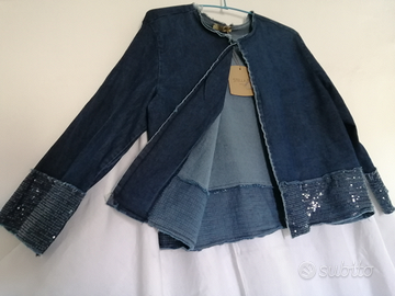Completo nuovo, con cartellini, mai indossato perché dopo l'acquisto ho dovuto effettuare una dieta che ha modificato la mia taglia.Tessuto: jeans stretch leggero e morbidissimo, leggermente sfrangiato ai bordi della giacca, 65%Cotone/Poliestere/Elastan. Il colore reale talvolta è leggermente modificato dai riflessi della luce; in questo caso, il blu è quello della seconda foto, in cui si vede la giacchina con un lembo aperto verso sinistra. La taglia riportata sul cartellino è M/L. L'insieme è composto da :1) Giacchina sfoderata, diritta, girocollo; maniche diritte, 3/4; chiusura con gancetto allo scollo; tutt'intorno e sul fondo delle maniche, una balza di rifinitura in tinta, alta 10cm, ricamata completamente con piccole paillettes. Misure in cm: spalle 43, larghezza giacca 53, lunghezza del davanti dal centro-scollo all'orlo 45, lunghezza del retro dal centro-scollo all'orlo 50; larghezza manica 18 (appena più stretta verso il fondo:16,5), lunghezza manica 47. 2)Pantaloni con elastico in vita ed alle caviglie. Su ogni gamba, una grande tasca con patta di paillettes, alta 6cm. Misure in cm: larghezza vita con elastico tirato al massimo 53, largh. massima fianchi 53, largh. massima coscia 30, largh. gamba in fondo 24cm, lunghezza gamba lato esterno 97, lungh. gamba lato interno 70. N. B. Le misure non indicano circonferenze, ma larghezze o lunghezze perché sono state prese appoggiando i capi su un piano. Consiglio di completare l'insieme con una canotta o una t-shirt bianca e sneakers basse, stringate, anch' esse bianche.