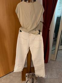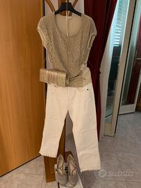 Bellissimo completo pantaloni composto da pantaloni beige Sandro Ferrone tg 44, maglietta ricamata Nero Giardini tg M color tortora , scarpe color tortora con zeppa 39 e borsetta tracolla dorata